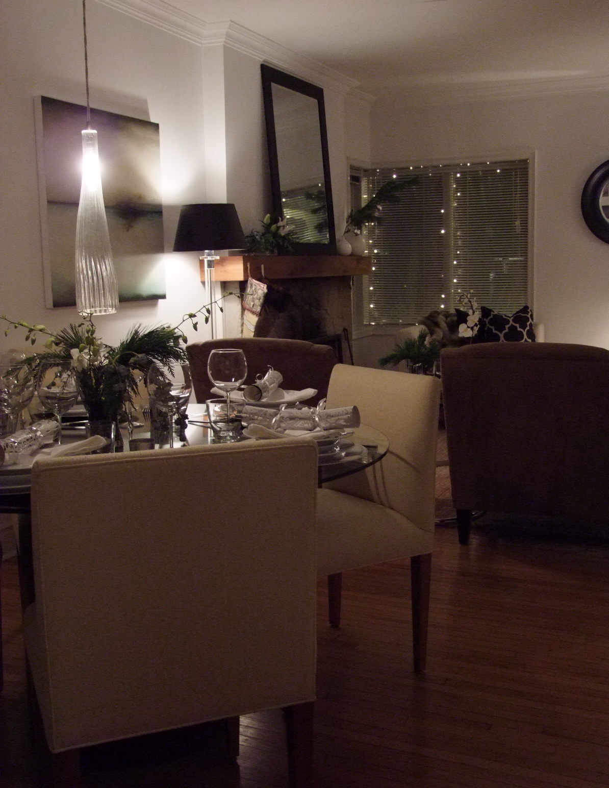 Our dining table last Christmas,,,,,and our $2 light fixture from Habitat for Humanity (which replaced an unsightly ceiling fan). Even though this is just a rental property and is not a 'designer home' by any means it's never stopped me from entertaining here - I can't stress enough how strongly I feel about this - never hold off from entertaining family and friends because you think your house isn't 'perfect' yet, your guests really won't care. Make the most of what you have, you can create an inviting and festive atmosphere with simple things and have memories you'll cherish forever.
